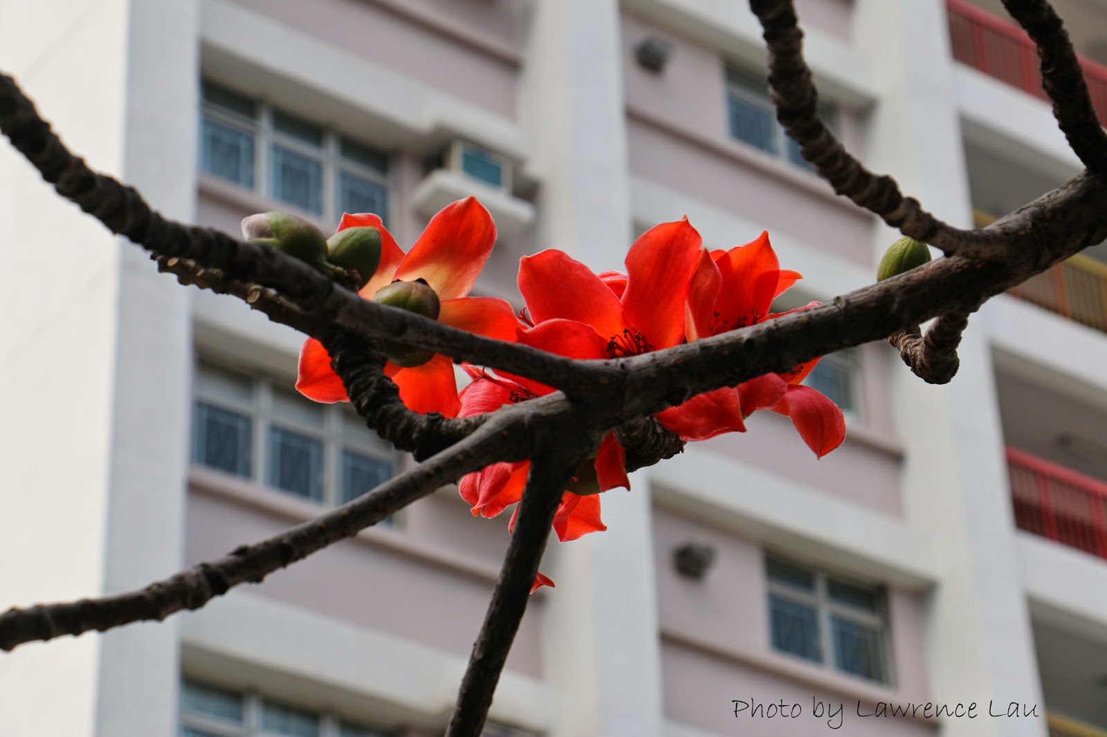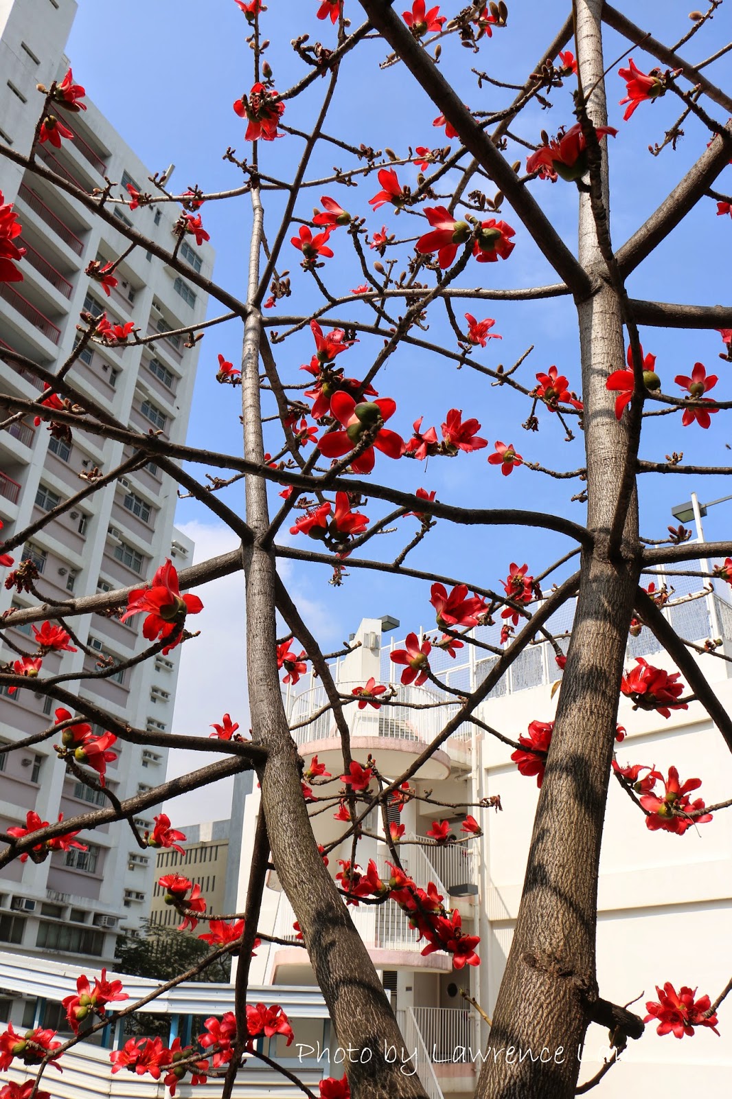 近日天氣和暖,木棉花緊接盛放,就在青山道近饒宗頤文化館附近的天橋上,挺拔的木棉樹上綻放著的朵朵火紅的木棉花,把天空點染得紅豔瑰麗。