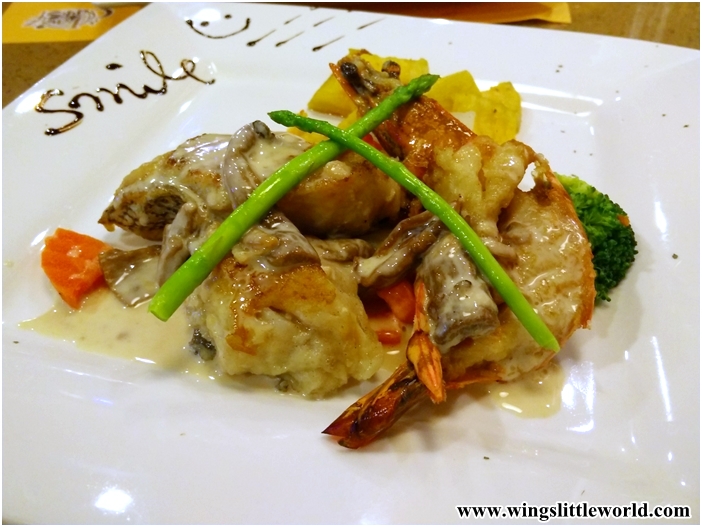 燒大蝦拼石班柳伴牛肝菌忌廉汁 ($198)