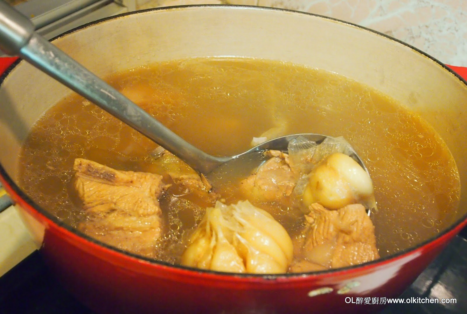 加入排骨,白胡椒煮至滾起後,轉小火繼續煮60分鐘。