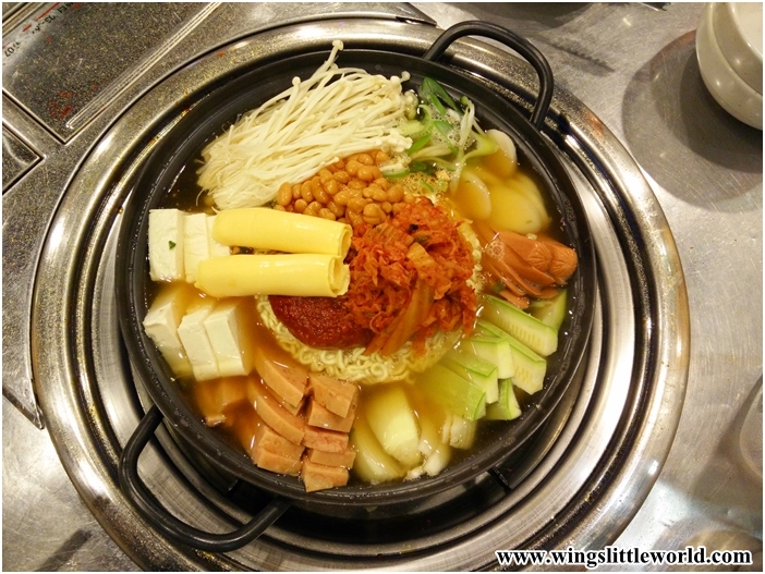 最後,我們點了一個部隊鍋啦。看似很普通的食材,其實一點也不普通。超喜歡那塊芝士,把整個部隊鍋的香味大大提升,色彩也顯得更鮮明的啦~!!!至於麵上面的韓國辣醬更是這個鍋的精粹,令整個鍋超級惹味;泡菜也是不可或決的,酸酸辣辣,十分開胃;其餘的配料讓整個部隊火鍋更豐富,更帶有韓式地道風味~