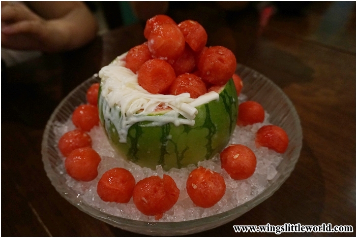 這個綿綿冰一共四種口味的,分別是榴蓮、豆腐、芒果及益力多口味。我們選了豆腐味,原來說四個口味都是以「西瓜盅」形式出現,就只是綿綿冰的味道改變而已。這個豆腐綿綿冰給我的感覺呢,像是在吃豆腐花般香甜滑溜,豆腐味淡淡的在味蕾上跑出來,加上清甜多汁的西瓜,整個配搭也蠻不錯的。作為夏日的消暑食物,這個實在是不錯啦~