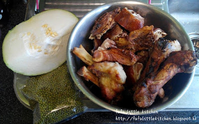 材料: 燒豬骨2份、綠豆1包、冬瓜2斤、蜜棗2粒、鹽適量、水6大碗