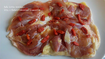 2. 杞子用水浸軟,再放上醃好的雞扒上。