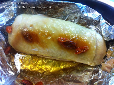 3. 將雞扒卷成圖柱狀,用錫紙包實。