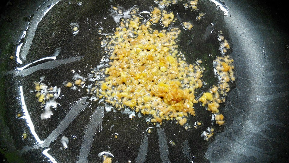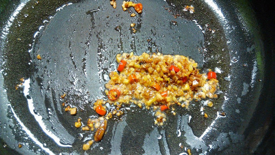 3. 燒熱油爆香蒜蓉及指天椒,直至蒜蓉變色。