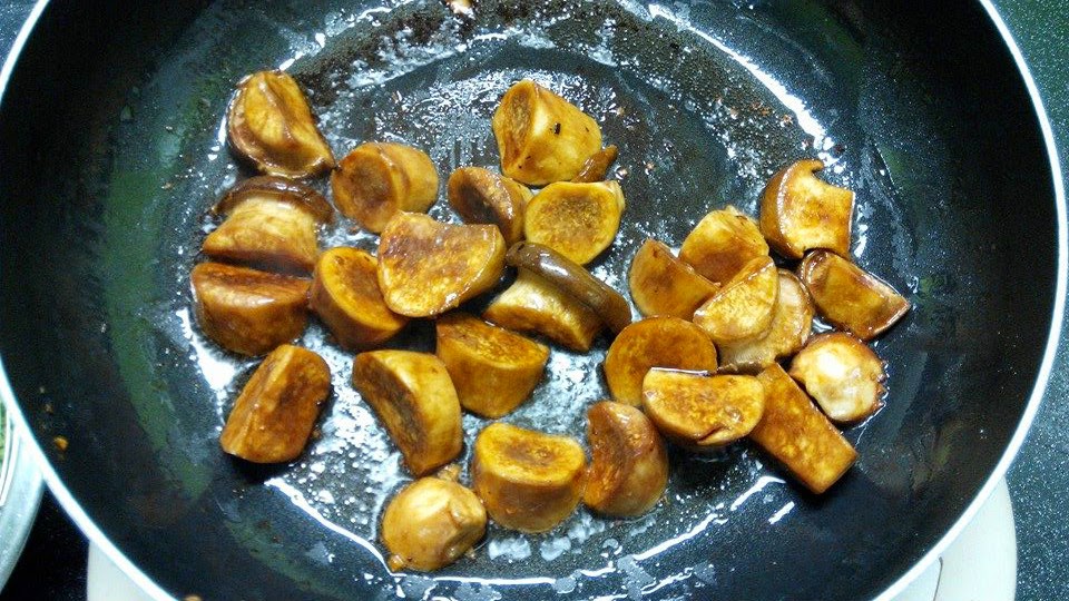 5. 杏鮑菇放入蒜油中同炒,至其變熟盛起。