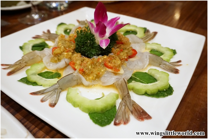 吃泰菜又怎少得了泰式生蝦,生蝦刺身的肉質爽口,膠質十分豐富。蝦上面的秘製泰式辣醬比平日吃的還要辣,生蝦跟辣醬跟生苦瓜,加起來在口中的感覺十分有層次。落到喉嚨之後,就感到有一種刺激的感覺湧上,這個味道十分討好。