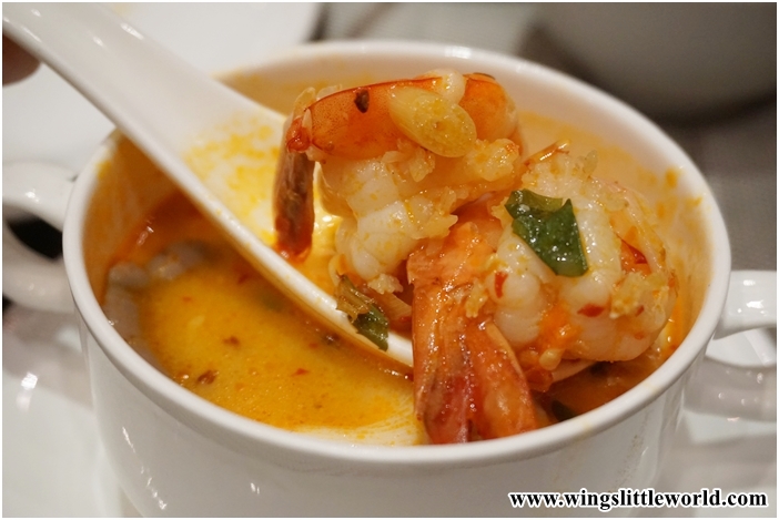 分好每人一碗湯以後,看看碗內的材料吧,很豐富的鮮蝦,十分爽口彈牙,是為冬蔭功湯的其中一個必要元素;還有的是湯的酸辣味,吃落整個人暖笠笠的,酸辣的味道適中,跟在泰國時喝的正宗冬蔭功湯感覺蠻相近的,而且吃完以後十分開胃。