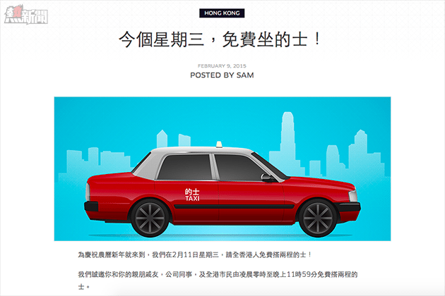 《Uber》宣佈,明天 (2月11日) 進行只限一天的免費叫車服務,使用者只要經 Uber app 叫車,就可以免費坐兩程 UberTAXI,最高車資優惠為 HK$200,如果超出限額則要自行支付差額。但要留意的是取消叫車的話會被公司收取 HK$10 取消費,因此大家要注意了。