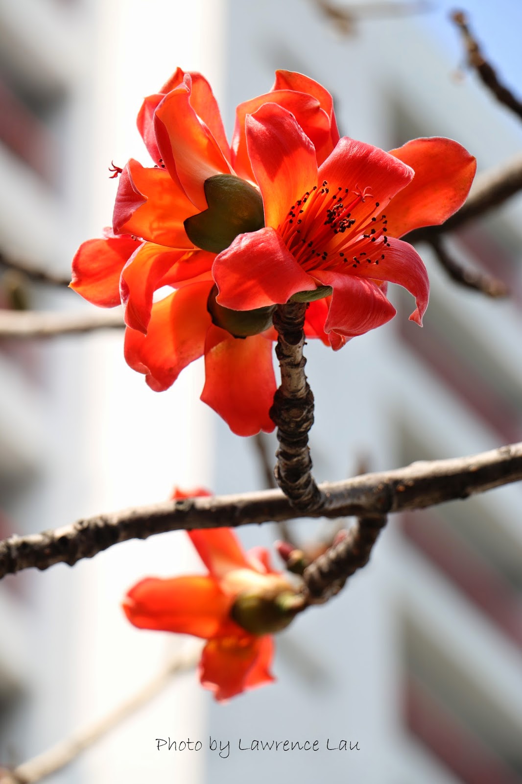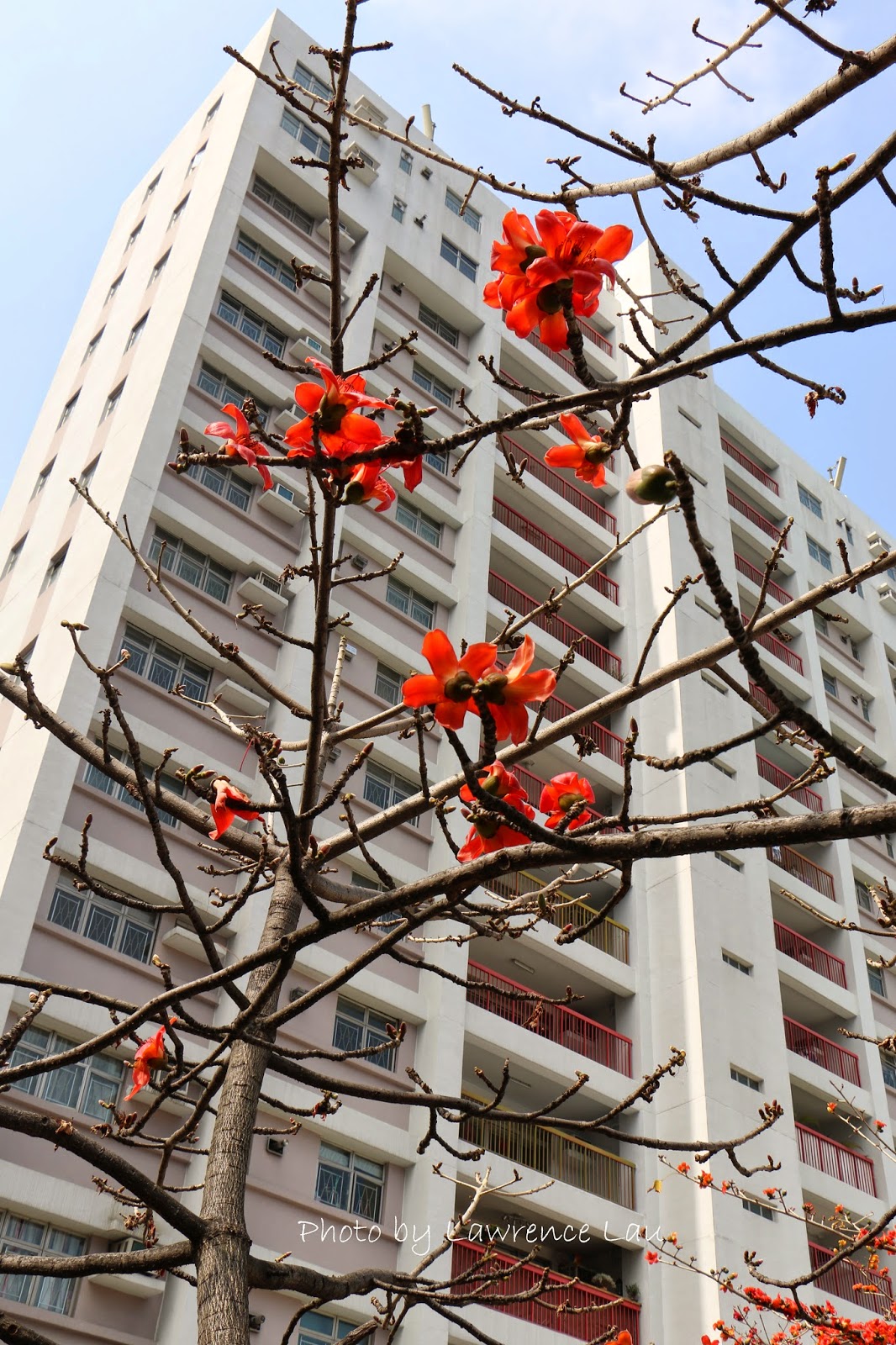 近日天氣和暖,木棉花緊接盛放,就在青山道近饒宗頤文化館附近的天橋上,挺拔的木棉樹上綻放著的朵朵火紅的木棉花,把天空點染得紅豔瑰麗。