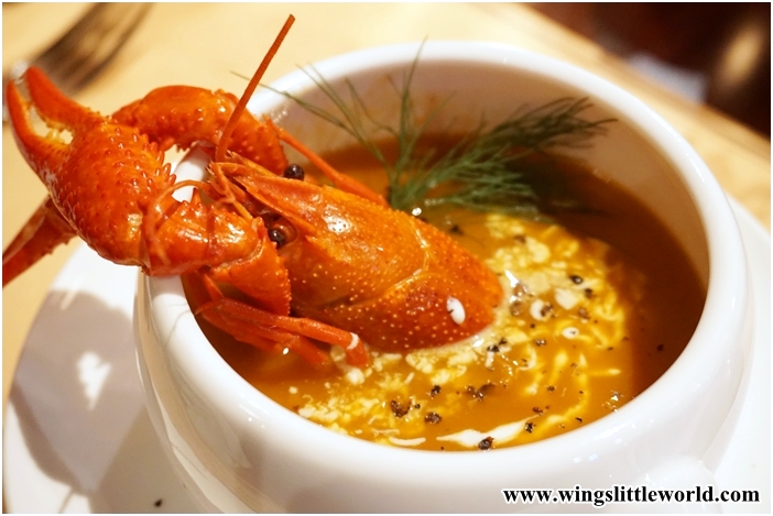 超有睇頭先海鮮湯,龍蝦味超重的,侍應為Wing在湯中加上點點的黑胡椒。黑胡椒在這裡不但有調味的作用,而且有減淡原有那點點腥味的感覺。其實腥味是必定有的味道啦,而且還要相機先食….嗯…所以加上黑胡椒以後,很香很易入口呢~