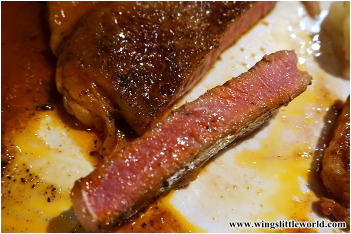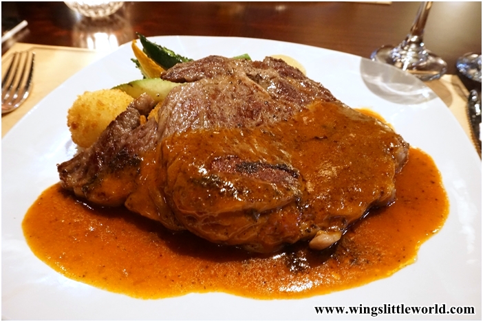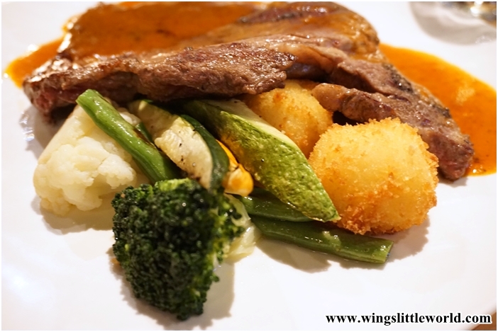 至於肉眼扒呢,味道跟想像中的完全一樣,七成熟的肉眼扒,外面煎得剛剛好,入面是十分粉嫩的,顏色看上去蠻不錯的啦,黑松露菌燒汁加在肉眼扒上面,把牛肉的肉味帶出,肉味更濃郁。另一方面,肉眼扒的肥瘦平均,怕肥的女生如我都失去了抗拒脂肪的力量丫~=3=