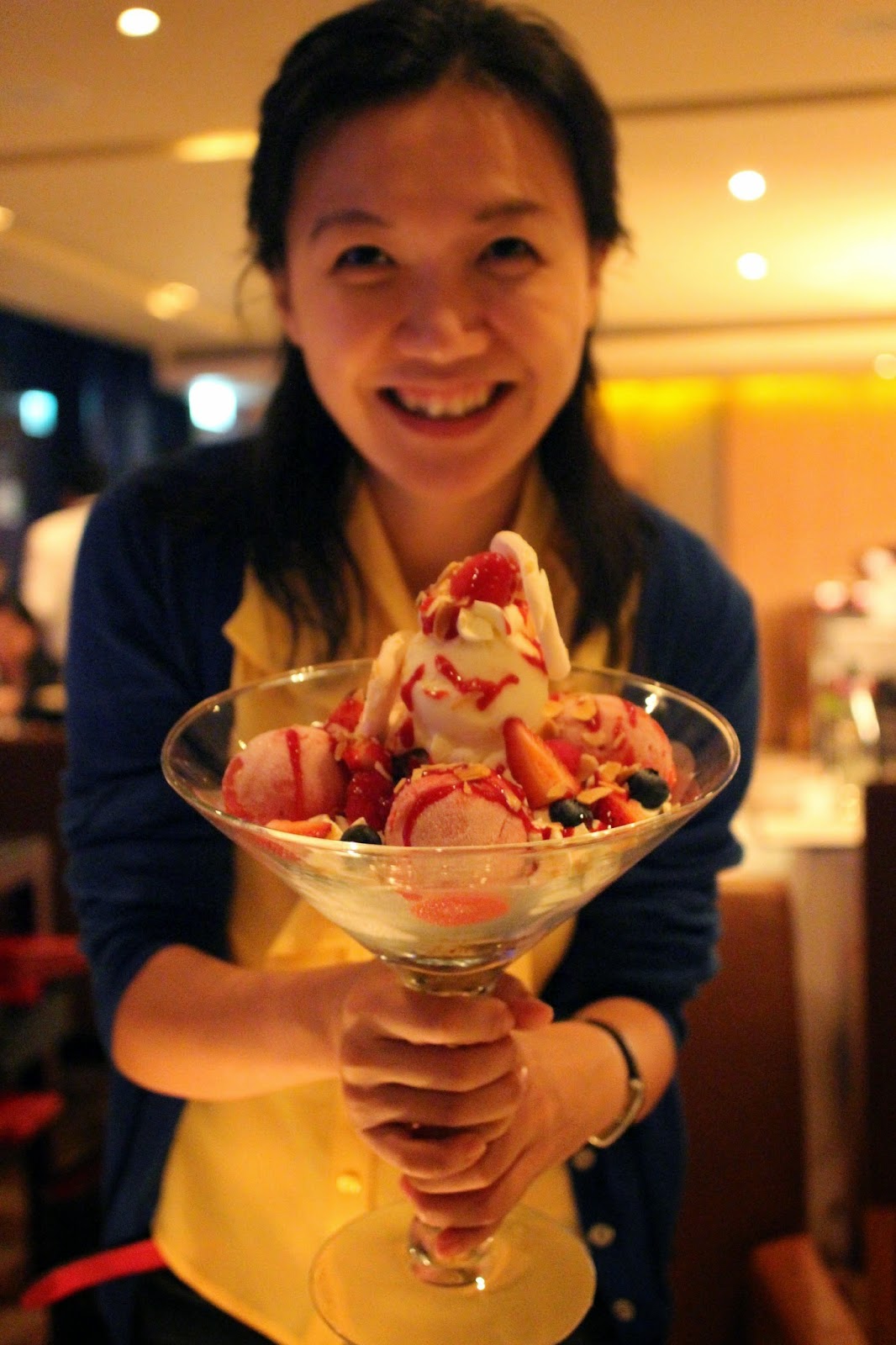最失色是 SWEET POTATO FRIES WITH CHEESE DIP,甜蕃薯條與香濃芝士醬沒有擦出火花,早知選點薯條會更好。結果吃剩不少的。 也是時間來到甜品了... 這裡甜品由已最初首訪的$130份,加至 $150再$220,現時是$298份。不過其份量之大,仍會令甜魔慕名而來。   首先是 BERRIES SUNDAE -- BLUEBERRY ICE-CREAM, YOGHURT SHERBET, RASPBERRY SHERBET, CRISPYALMOND MERINGUE,看圖大家不知它有多大,由甜魔媽媽來做對比就一清二楚了!雪糕口味都很清新,最好吃是乳酪味;配料的脆杏仁蛋白餅口感香脆,也有驚喜;見大家都停了手,由我來清光吧~可我始終是朱古力魔,如果由雜莓變成朱古力新地,會更加愛!