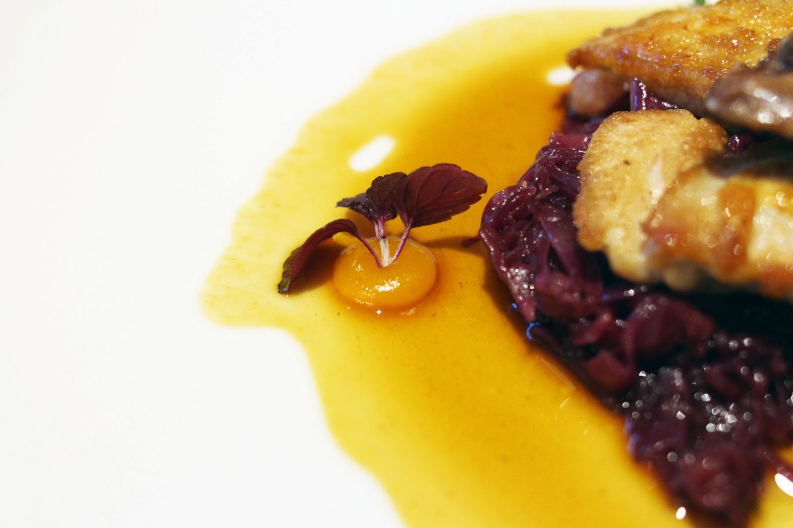 另一主菜是輕煎鵪鶉配燴紅椰菜、香橙果醬及鴨汁,那鵪鶉實在是超級肉嫩美味啊!最妙是配搭上香橙果醬,酸甜酸甜的十分開胃,墊底還有繽紛悅目的紅椰菜,更加惹動食慾了。不過我總覺得鵪鶉與乳鴿是近親,沒敢吃太多,筆時卻又開始想念了...