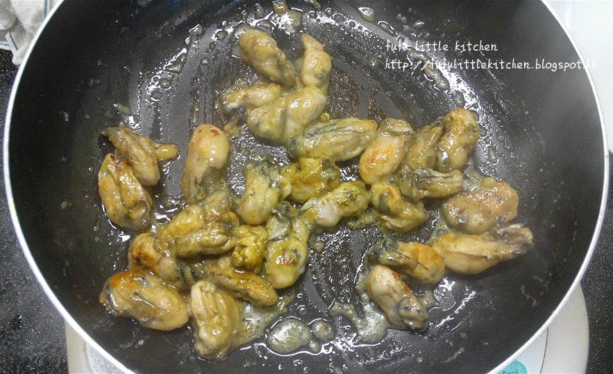 1. 韓國蠔用生粉拌後再洗淨,汆水盛起後抹乾備用。