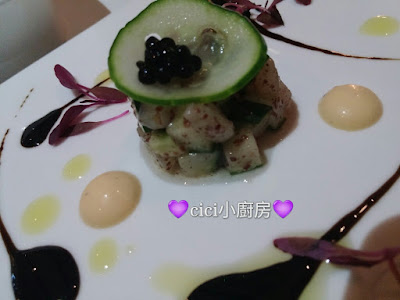 跟著第一道菜,Amuse Bouche。 廚房精緻地將鮮甜的帶子,拌上清爽的青瓜片、 魚子醬,配上黑醋和沙律醬,味道來得鮮甜清新美味。