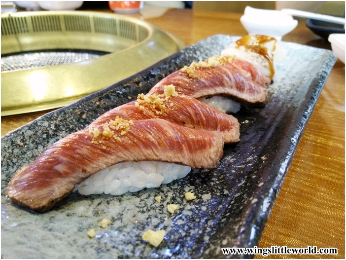 黑椒蒜香和牛壽司:和牛的大小跟飯的多少洽到好處的,一口就可以把整件壽司吃掉。入口先是蒜香味,再來就是吃到和牛,那個和牛味很香的,有種入口以後,每一個味薔都想要感受它的氣味似的,那個香氣真的很難忘;