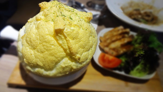 梳乎厘芝士焗飯有數款選擇,而我揀的是沖繩阿古豚肉梳孚厘飯,送上來是真的有點看呆了眼,因為焗飯的造型跟梳乎厘簡直是一模一樣,把外層充滿彈性的梳乎厘切開,內藏著滿滿的芝士焗飯。