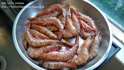 材料: 海蝦17隻、蒜頭2個、粉絲1包、鹽少許、雞粉少許、蒸魚醬油適量
