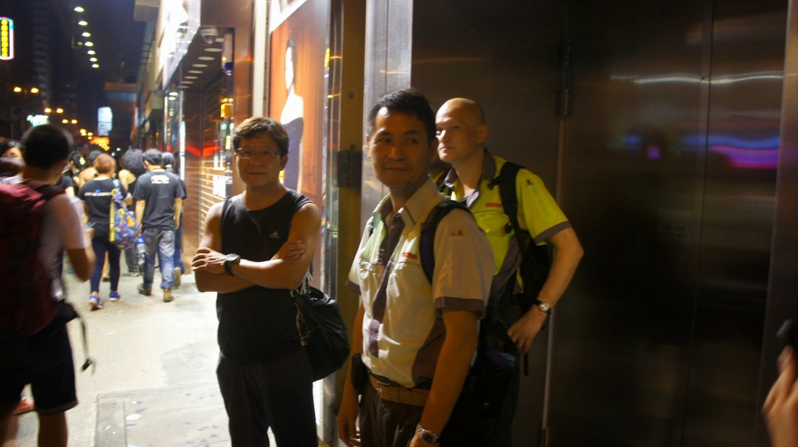 之後匯豐門前有三名九巴司機, 原來九巴公司命司機到來看守被渚塞的巴士, 平日可以在車廂內涼冷氣, 這幾天就只能坐在地上呆等時間過去, 朱站長:「司機都好, 3-4個鐘就可以轉更, 我就要睇足一整更, 不過無所謂啦, 都係返公遮, 而且睇到成班年輕人咁有衝勁, 追求理想, 我年輕都做過, 只要和平, 理性就得啦」