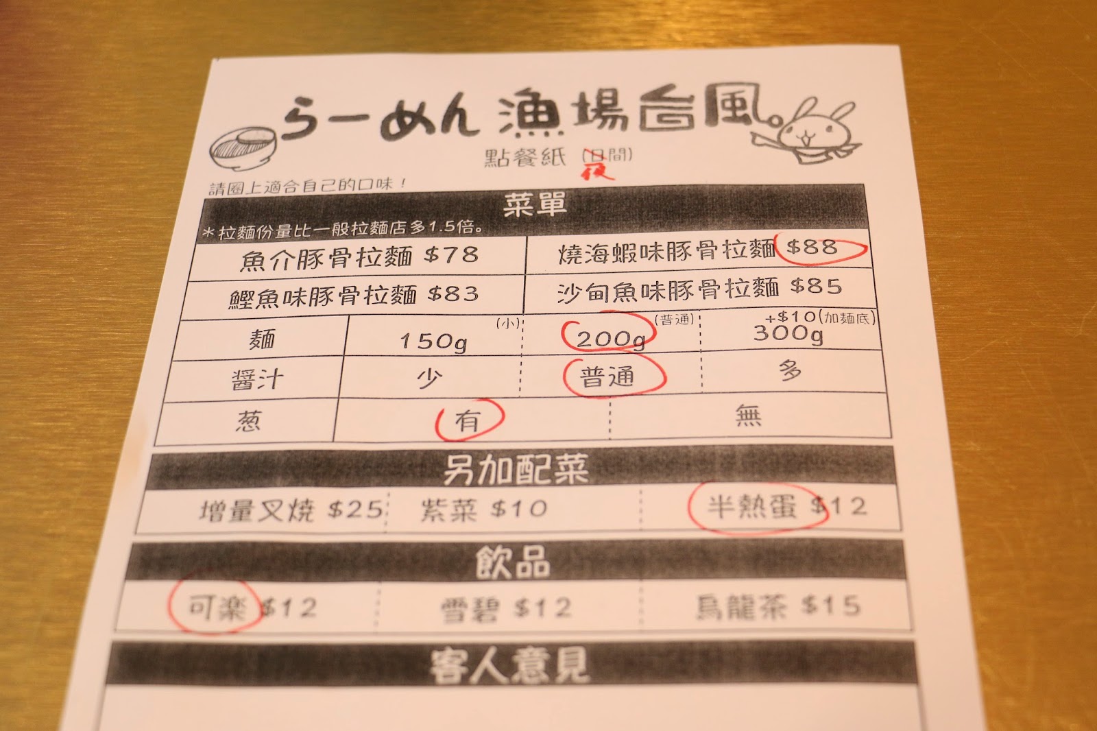 這店晚上售賣的湯麵共有四款,分別是最基本的「魚介豚骨拉麵」($78)、最受歡迎的「燒海蝦味豚骨拉麵」($88)、充滿濃郁鰹魚味的「鰹魚味豚骨拉麵」($83)和適合喜歡海洋味道客人的「沙甸魚味豚骨拉麵」($85)。