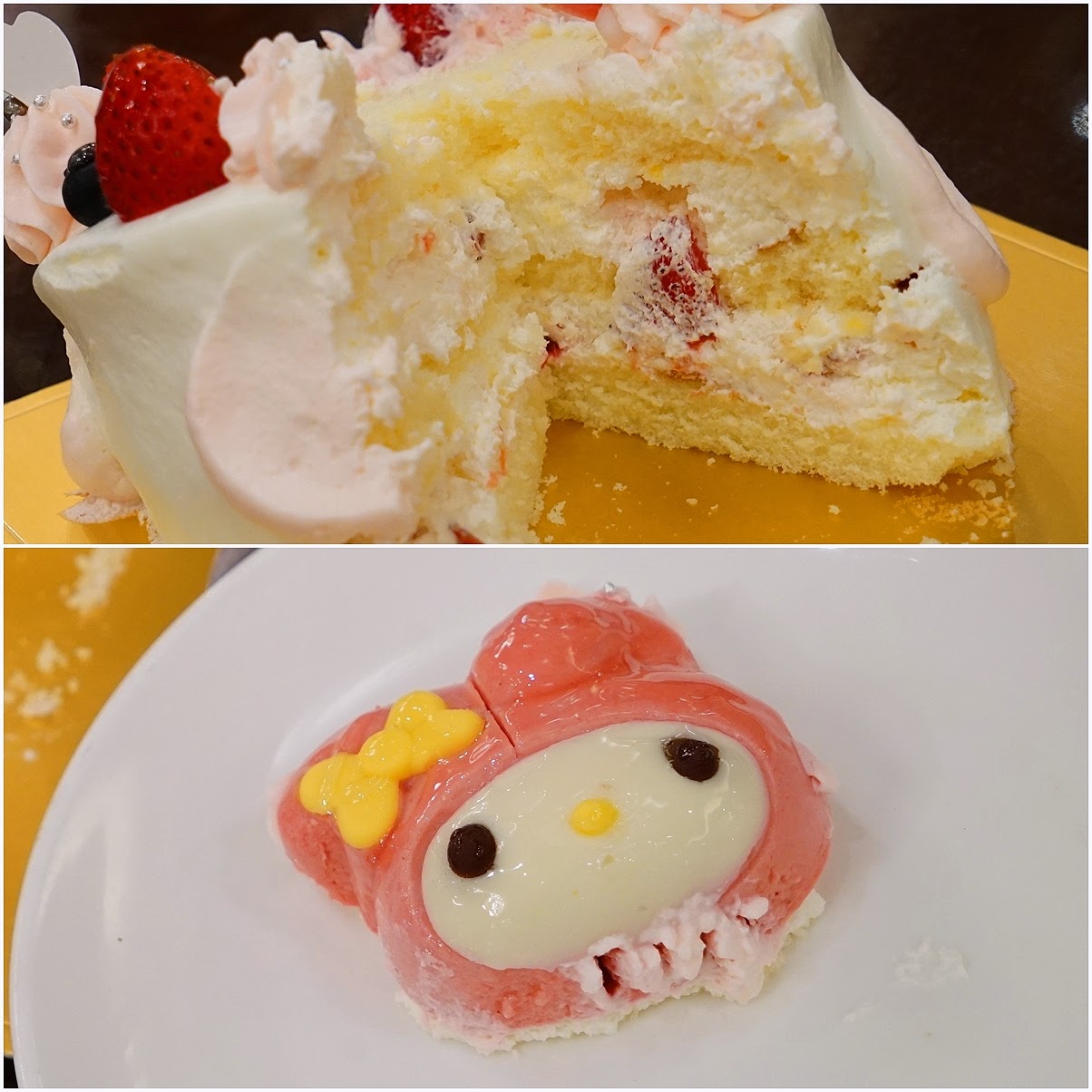 本來想將Melody一分為二, 但原來白色的臉龐是朱古力制成, 切不下, 於是只可以將Melody抽出來, 整個海綿蛋糕立即出現。