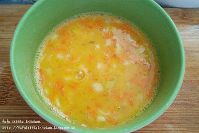 材料: 雞蛋3隻、紅蘿蔔0.5條、洋蔥1/4個、醬油適量
