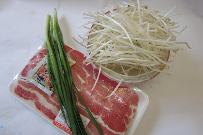火鍋肥牛一份,薑絲1湯匙,芽菜1碗,韮菜少許,蒜茸1湯匙,辣椒粒1湯匙,蔥花3湯匙
