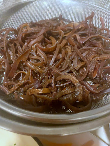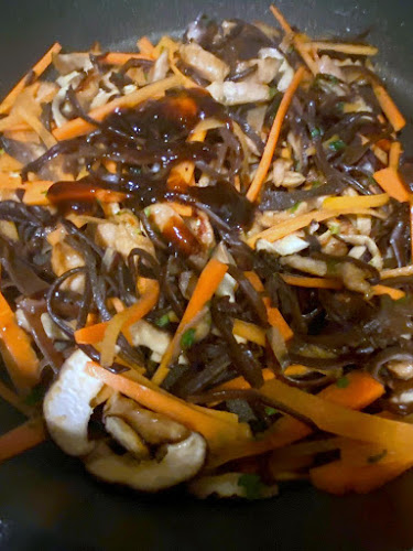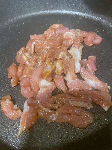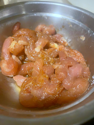 豬肉絲先落糖、再加生抽撈勻、加生粉撈勻,最後加少少麻油撈勻備用