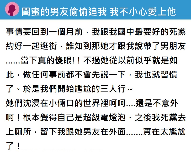 我跟我國中最要好的死黨約好一起逛街,誰知到那她才跟我說帶了男朋友……當下真的傻眼!!!!!!!!